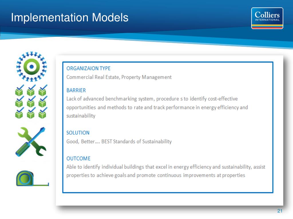 Colliers Sustainability Sustainability We educate and lead our team to adopt sustainable practices that increase our Clients’ asset value on an economic, environmental and social basis. Colliers will set and meet specific goals (LEED certifications, ENERGY STAR benchmarking, green procurement programs and green workplace productivity models) and collaborate with our Clients to ensure we optimize property performance, boost building occupant health and productivity, work to reduce our environmental impact and conserve our natural resources. Our long-term corporate value is to generate sustained economic and ecological value for our Clients, which in turn positively affects our communities and employees.