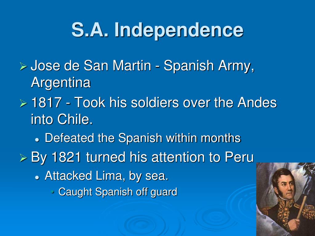 S.A. Independence • Jose de San Martin - Spanish Army, Argentina • 1817 - Took his soldiers over the Andes into Chile. • Defeated the Spanish within months • By 1821 turned his attention to Peru • Attacked Lima, by sea. • Caught Spanish off guard