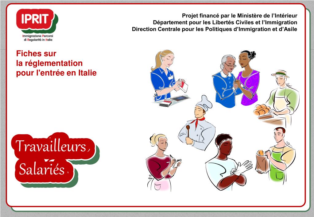 Projet financé par le Ministère de l’Intérieur Département pour les Libertés Civiles et l’Immigration Direction Centrale pour les Politiques d’Immigration et d’Asile Fichessurla réglementationpour l'entrée en Italie TravailleursSalariés TravailleursSalariés TravailleursSalariés TravailleursSalariés TravailleursSalariés