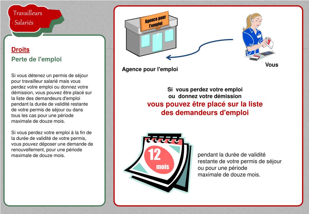 TravailleursSalariés la proposition de l'employeur est acceptée TravailleursSalariés TravailleursSalariés Agence pour l'emploi Droits Perte de l'emploi Vous Agence pour l'emploi Si vous détenez un permis de séjour pour travailleur salarié mais vous perdez votre emploi ou donnez votre démission, vous pouvez être placé sur la liste des demandeurs d'emploi pendant la durée de validité restante de votre permis de séjour ou dans tous les cas pour une période maximale de douze mois.Si vous perdez votre emploi à la fin de la durée de validité de votre permis, vous pouvez déposer une demande de renouvellement, pour une période maximale de douze mois. Si vous perdez votre emploi ou donnez votre démission 12mois TravailleursSalariés TravailleursSalariés vous pouvez être placé sur la liste des demandeurs d'emploi pendant la durée de validité restante de votre permis de séjour ou pour une période maximale de douze mois.
