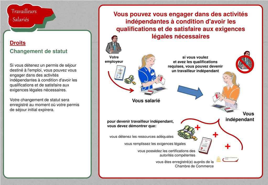 exigences légales contrats de travail TravailleursSalariés la proposition de l'employeur est acceptée TravailleursSalariés TravailleursSalariés Vous pouvez vous engager dans des activités indépendantes à condition d'avoir les qualifications et de satisfaire aux exigences légales nécessaires Droits Changement de statut si vous voulez et avez les qualifications requises, vous pouvez devenir un travailleur indépendant Si vous détenez un permis de séjour destiné à l'emploi, vous pouvez vous engager dans des activités indépendantes à condition d'avoir les qualifications et de satisfaire aux exigences légales nécessaires.Votre changement de statut sera enregistré au moment où votre permis de séjour initial expirera. TravailleursSalariés TravailleursSalariés Voussalarié Vous indépendant pour devenir travailleur indépendant, vous devez démontrer que: Votreemployeur vous détenez les ressources adéquates vous remplissez les exigences légales vous possédez les certifications des autorités compétentes vous êtes enregistré(e) auprès de la Chambre de Commerce