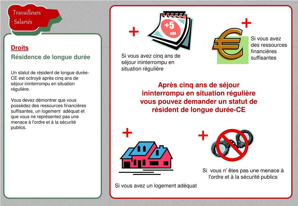 TravailleursSalariés la proposition de l'employeur est acceptée TravailleursSalariés TravailleursSalariés Si vous avez des ressources financières suffisantes Droits Si vous avez cinq ans de séjour ininterrompu en situation régulière Résidence de longue durée Un statut de résident de longue durée-CE est octroyé après cinq ans de séjour ininterrompu en situation régulière.Vous devez démontrer que vous possédez des ressources financières suffisantes, un logement adéquat et que vous ne représentez pas une menace à l'ordre et à la sécurité publics. Après cinq ans de séjour ininterrompu en situation régulière vous pouvez demander un statut de résident de longue durée-CE +5ans TravailleursSalariés TravailleursSalariés Si vous n’ êtes pas une menace à l'ordre et à la sécurité publics Si vous avez un logement adéquat