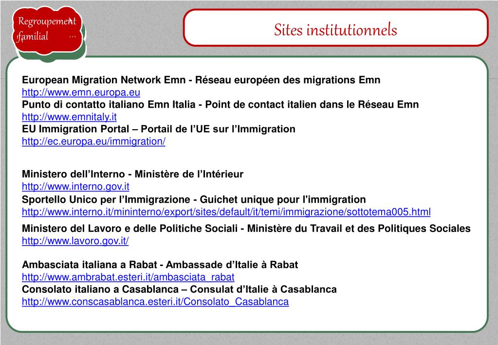 Regroupement familial Sites institutionnels Membres devotrefamille Membres devotrefamille Membres devotrefamille Membres devotrefamille European Migration Network Emn - Réseaueuropéendesmigrations Emn http://www.emn.europa.eu Punto di contatto italiano Emn Italia - Point de contact italien dans leRéseau Emn http://www.emnitaly.it EU Immigration Portal – Portail de l’UE sur l’Immigration http://ec.europa.eu/immigration/ Ministero dell’Interno - Ministère de l’Intérieurhttp://www.interno.gov.it SportelloUnico per l’Immigrazione - Guichet unique pour l'immigrationhttp://www.interno.it/mininterno/export/sites/default/it/temi/immigrazione/sottotema005.html MinisterodelLavoro e delle PoliticheSociali - Ministère du Travail et des Politiques Sociales http://www.lavoro.gov.it/ Ambasciata italiana a Rabat - Ambassade d’Italie à Rabat http://www.ambrabat.esteri.it/ambasciata_rabat Consolato italiano a Casablanca – Consulat d’Italie à Casablanca http://www.conscasablanca.esteri.it/Consolato_Casablanca