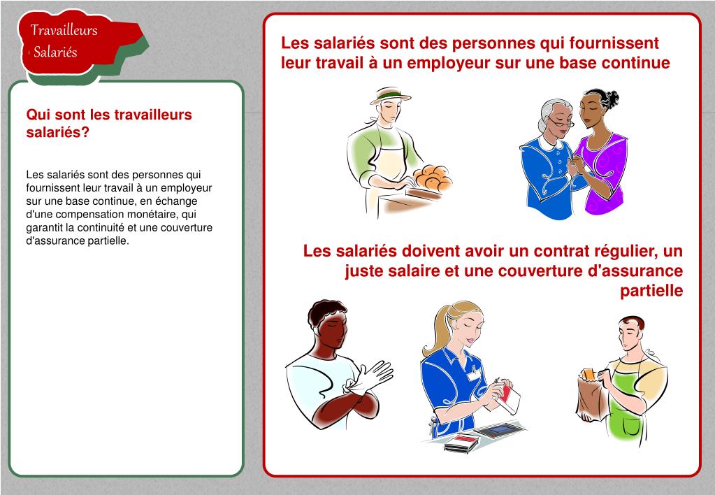 TravailleursSalariés TravailleursSalariés TravailleursSalariés Les salariés sont des personnes qui fournissent leur travail à un employeur sur une base continue Qui sontlestravailleurssalariés? Les salariés sont des personnes qui fournissent leur travail à un employeur sur une base continue, en échange d'une compensation monétaire, qui garantit la continuité et une couverture d'assurance partielle. TravailleursSalariés TravailleursSalariés Les salariés doivent avoir un contrat régulier, un juste salaire et une couverture d'assurance partielle