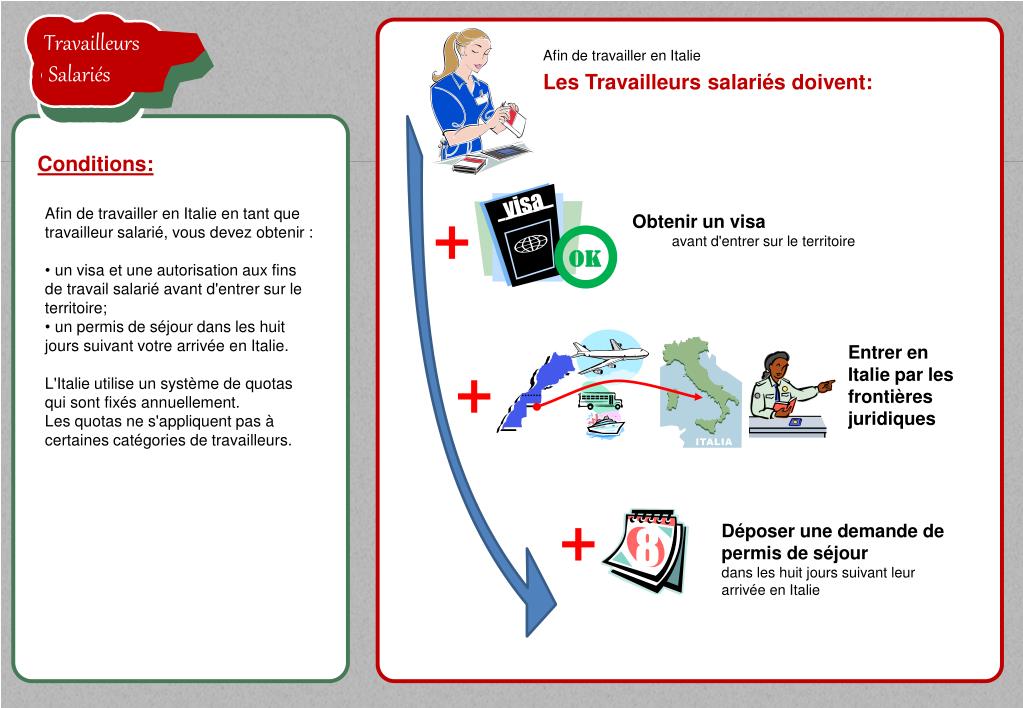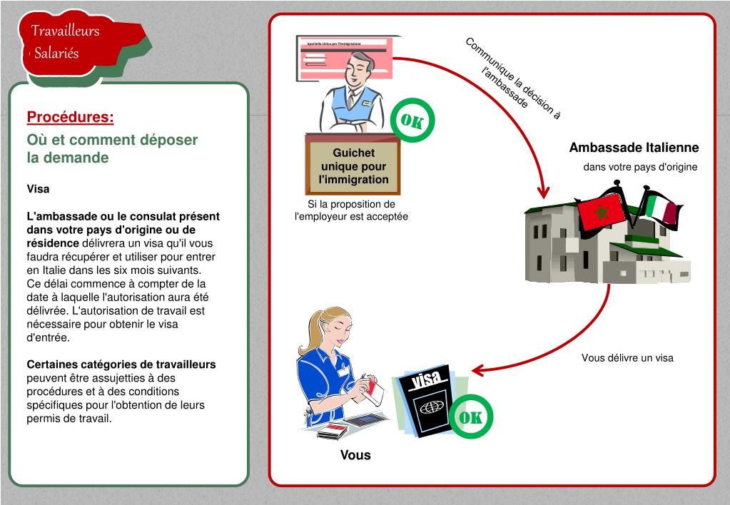 TravailleursSalariés la proposition de l'employeur est acceptée TravailleursSalariés TravailleursSalariés Sportello Unico per l'Immigrazione Communique la décision à l'ambassade Procédures: Où et comment déposer la demande AmbassadeItalienne dans votre pays d'origine Visa L'ambassade ou le consulat présent dans votre pays d'origine ou de résidence délivrera un visa qu'il vous faudra récupérer et utiliser pour entrer en Italie dans les six mois suivants. Ce délai commence à compter de la date à laquelle l'autorisation aura été délivrée. L'autorisation de travail est nécessaire pour obtenir le visa d'entrée.Certaines catégories de travailleurs peuvent être assujetties à des procédures et à des conditions spécifiques pour l'obtention de leurs permis de travail. Si la proposition de l'employeur est acceptée TravailleursSalariés TravailleursSalariés OK OK visa Guichet unique pour l'immigration Vous délivre un visa Vous