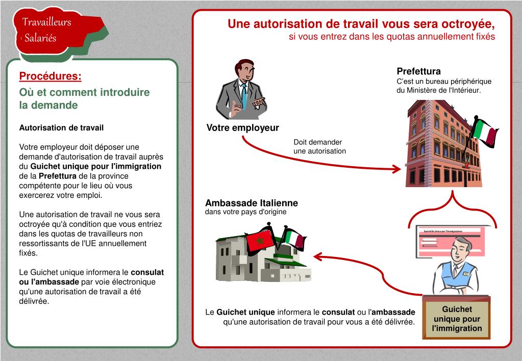 TravailleursSalariés TravailleursSalariés TravailleursSalariés Une autorisation de travail vous sera octroyée, si vous entrez dans les quotas annuellement fixés Sportello Unico per l'Immigrazione Prefettura Procédures: C’est un bureau périphérique du Ministère de l'Intérieur. Où et comment introduire la demande Autorisation de travail Votre employeur doit déposer une demande d'autorisation de travail auprès du Guichet unique pour l'immigration de la Prefettura de la province compétente pour le lieu où vous exercerez votre emploi.Une autorisation de travail ne vous sera octroyée qu'à condition que vous entriez dans les quotas de travailleurs non ressortissants de l'UE annuellement fixés.Le Guichet unique informera le consulat ou l'ambassade par voie électronique qu'une autorisation de travail a été délivrée. Doit demander une autorisation TravailleursSalariés TravailleursSalariés AmbassadeItalienne dans votre pays d'origine Guichet unique pour l'immigration Votreemployeur Le Guichet unique informera le consulat ou l'ambassadequ'une autorisation de travail pour vous a été délivrée.