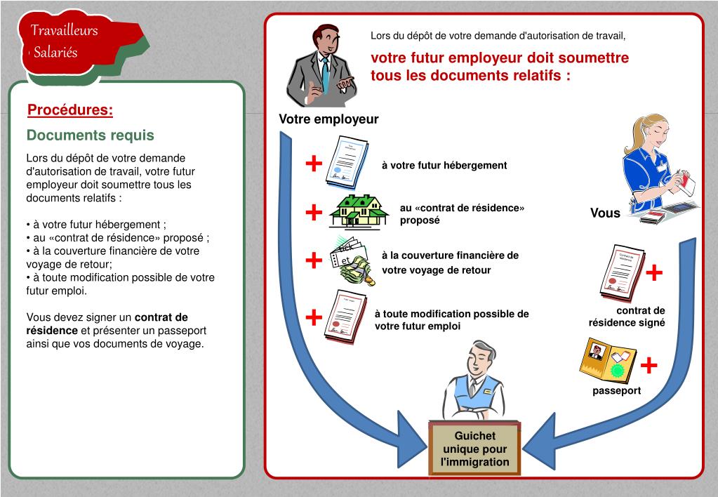 Contract de résidence Futur emploi Futur hébergement TravailleursSalariés la proposition de l'employeur est acceptée TravailleursSalariés TravailleursSalariés Lors du dépôt de votre demande d'autorisation de travail, votre futur employeur doit soumettretous les documents relatifs : Procédures: Documents requis • Lors du dépôt de votre demande d'autorisation de travail, votre futur employeur doit soumettre tous les documents relatifs : • à votre futur hébergement ; • au «contrat de résidence» proposé ; • à la couverture financière de votre voyage de retour; • à toute modification possible de votre futur emploi. • Vous devez signer un contrat de résidence et présenter un passeport ainsi que vos documents de voyage. ticket à votre futur hébergement Vous TravailleursSalariés au «contrat de résidence» proposé TravailleursSalariés à la couverture financière de votre voyage de retour contrat de résidence signé Guichet unique pour l'immigration Votreemployeur passeport à toute modification possible de votre futur emploi