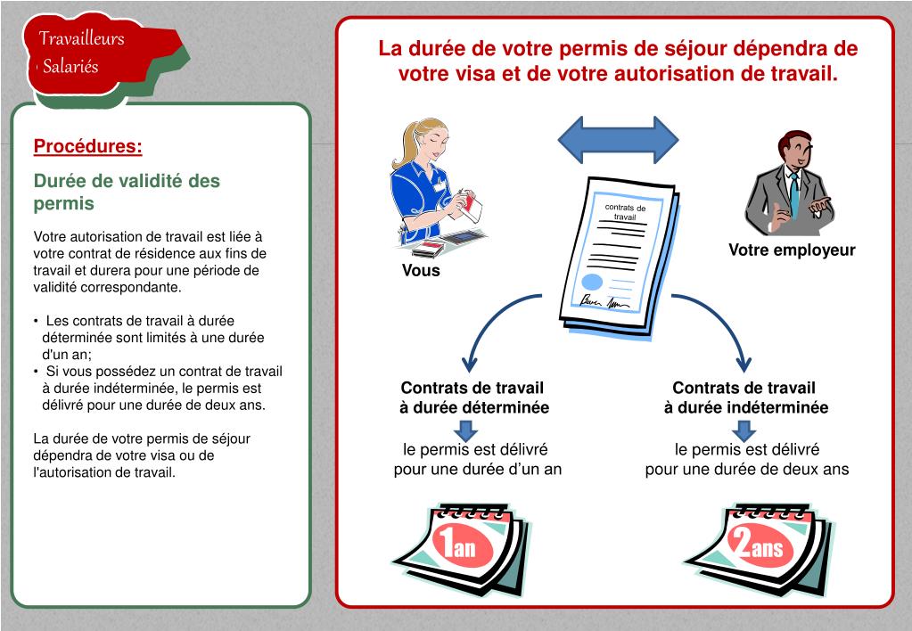 contrats de travail TravailleursSalariés la proposition de l'employeur est acceptée TravailleursSalariés TravailleursSalariés La durée de votre permis de séjour dépendra de votre visa et de votre autorisation de travail. Procédures: Durée de validité des permis • Votre autorisation de travail est liée à votre contrat de résidence aux fins de travail et durera pour une période de validité correspondante. • Les contrats de travail à durée déterminée sont limités à une durée d'un an; • Si vous possédez un contrat de travail à durée indéterminée, le permis est délivré pour une durée de deux ans. • La durée de votre permis de séjour dépendra de votre visa ou de l'autorisation de travail. 2ans 1an Vous TravailleursSalariés TravailleursSalariés Contrats de travail à durée déterminée Contrats de travail à durée indéterminée le permis est délivré pour une durée d’un an le permis est délivré pour une durée de deux ans Votreemployeur