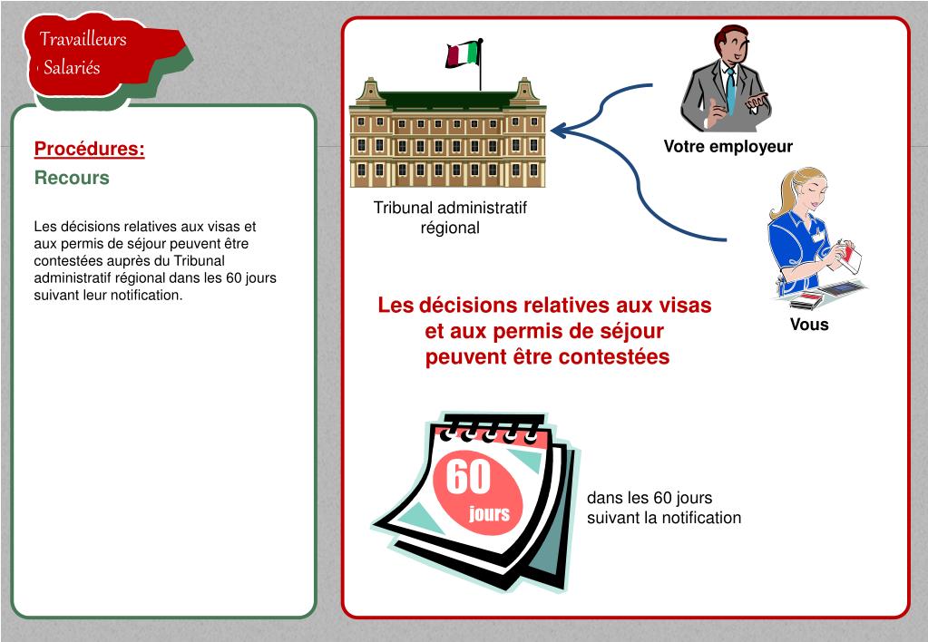 TravailleursSalariés la proposition de l'employeur est acceptée TravailleursSalariés TravailleursSalariés Procédures: Recours Tribunal administratif régional Les décisions relatives aux visas et aux permis de séjour peuvent être contestées auprès du Tribunal administratif régional dans les 60 jours suivant leur notification. 60jours Lesdécisions relatives aux visas et aux permis de séjour peuvent être contestées TravailleursSalariés TravailleursSalariés Vous Votreemployeur dans les 60 jours suivant la notification