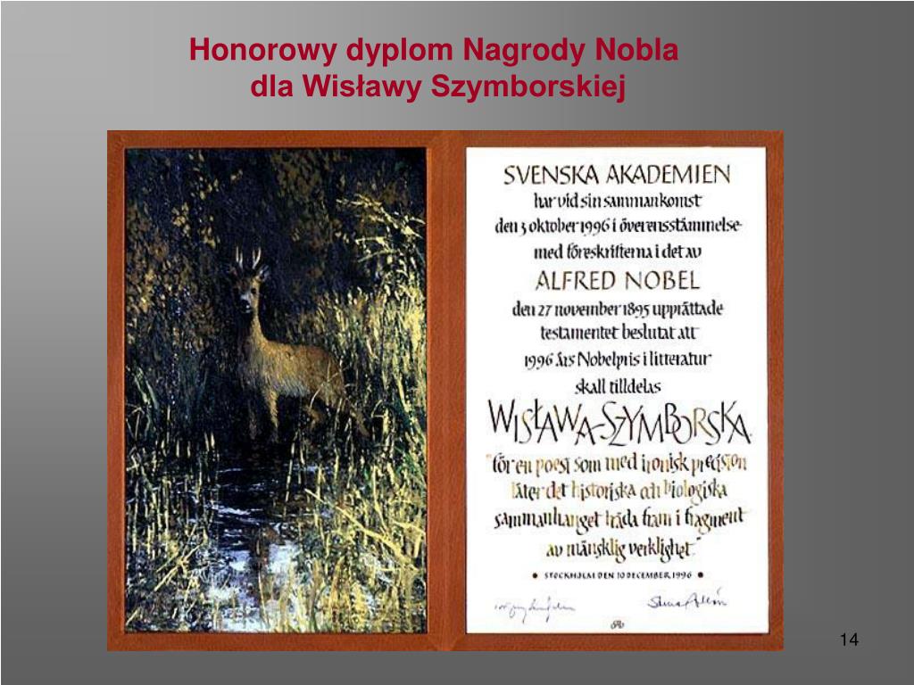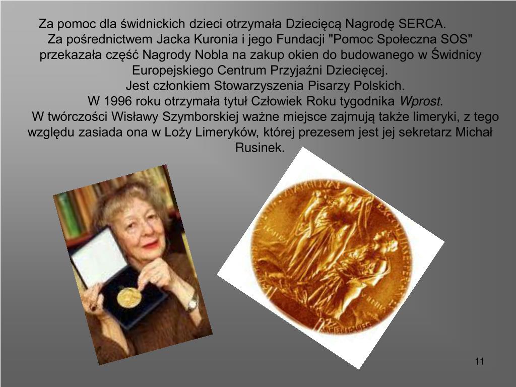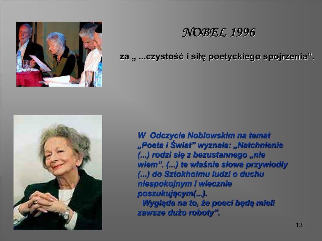 NOBEL 1996za „ ...czystość i siłę poetyckiego spojrzenia”. W Odczycie Noblowskim na temat „Poeta i Świat” wyznała: „Natchnienie (...) rodzi się z bezustannego „nie wiem”. (...) te właśnie słowa przywiodły (...) do Sztokholmu ludzi o duchu niespokojnym i wiecznie poszukującym(...). Wygląda na to, że poeci będą mieli zawsze dużo roboty”.