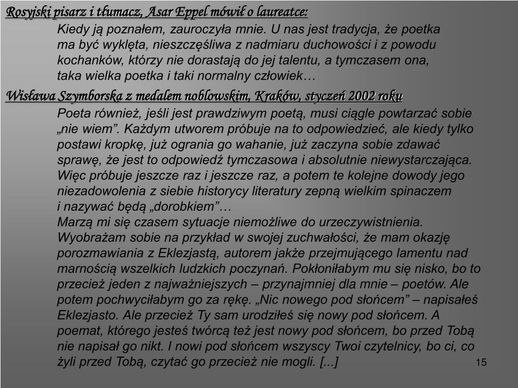 Rosyjski pisarz i tłumacz, AsarEppel mówił o laureatce: Kiedy ją poznałem, zauroczyła mnie. U nas jest tradycja, że poetka ma być wyklęta, nieszczęśliwa z nadmiaru duchowości i z powodu kochanków, którzy nie dorastają do jej talentu, a tymczasem ona, taka wielka poetka i taki normalny człowiek… Wisława Szymborska z medalem noblowskim, Kraków, styczeń 2002 roku Poeta również, jeśli jest prawdziwym poetą, musi ciągle powtarzać sobie „nie wiem”. Każdym utworem próbuje na to odpowiedzieć, ale kiedy tylko postawi kropkę, już ogrania go wahanie, już zaczyna sobie zdawać sprawę, że jest to odpowiedź tymczasowa i absolutnie niewystarczająca. Więc próbuje jeszcze raz i jeszcze raz, a potem te kolejne dowody jego niezadowolenia z siebie historycy literatury zepną wielkim spinaczem i nazywać będą „dorobkiem”… Marzą mi się czasem sytuacje niemożliwe do urzeczywistnienia. Wyobrażam sobie na przykład w swojej zuchwałości, że mam okazję porozmawiania z Eklezjastą, autorem jakże przejmującego lamentu nad marnością wszelkich ludzkich poczynań. Pokłoniłabym mu się nisko, bo to przecież jeden z najważniejszych – przynajmniej dla mnie – poetów. Ale potem pochwyciłabym go za rękę. „Nic nowego pod słońcem” – napisałeś Eklezjasto. Ale przecież Ty sam urodziłeś się nowy pod słońcem. A poemat, którego jesteś twórcą też jest nowy pod słońcem, bo przed Tobą nie napisał go nikt. I nowi pod słońcem wszyscy Twoi czytelnicy, bo ci, co żyli przed Tobą, czytać go przecież nie mogli. [...]