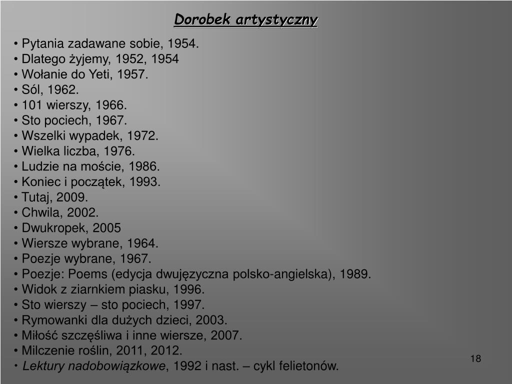 Dorobek artystyczny • Pytania zadawane sobie, 1954. • Dlatego żyjemy, 1952, 1954 • Wołanie do Yeti, 1957. • Sól, 1962. • 101 wierszy, 1966. • Sto pociech, 1967. • Wszelki wypadek, 1972. • Wielka liczba, 1976. • Ludzie na moście, 1986. • Koniec i początek, 1993. • Tutaj, 2009. • Chwila, 2002. • Dwukropek, 2005 • Wiersze wybrane, 1964. • Poezje wybrane, 1967. • Poezje: Poems (edycja dwujęzyczna polsko-angielska), 1989. • Widok z ziarnkiem piasku, 1996. • Sto wierszy – sto pociech, 1997. • Rymowanki dla dużych dzieci, 2003. • Miłość szczęśliwa i inne wiersze, 2007. • Milczenie roślin, 2011, 2012. • Lektury nadobowiązkowe, 1992 i nast. – cykl felietonów.