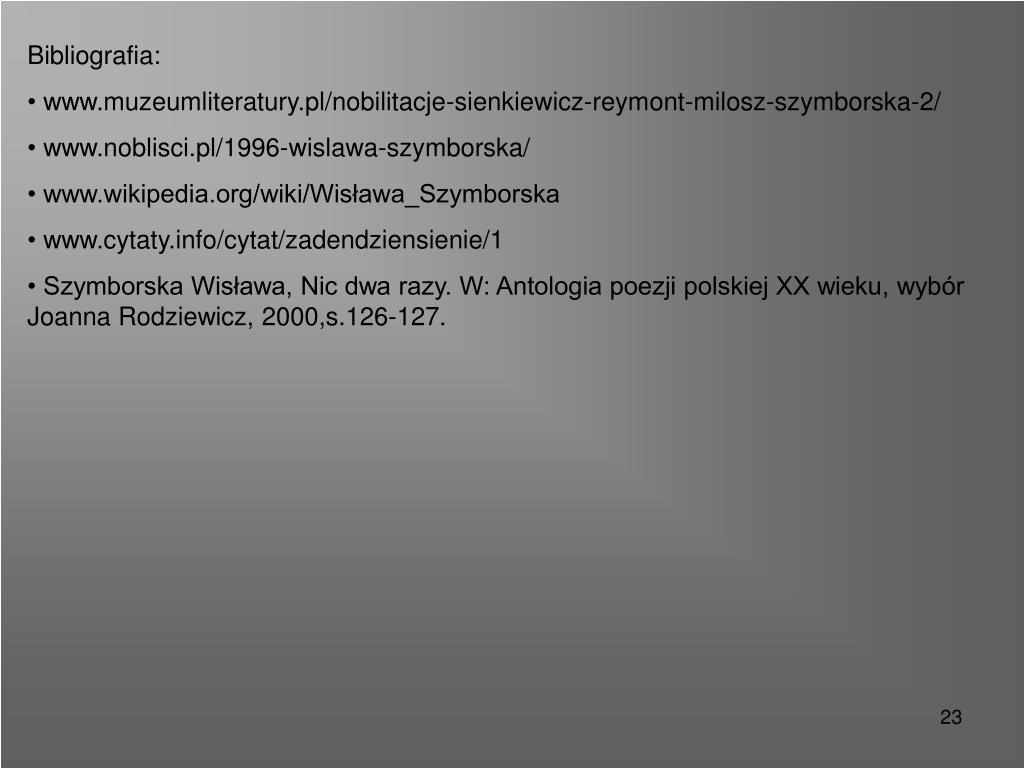 Bibliografia: • www.muzeumliteratury.pl/nobilitacje-sienkiewicz-reymont-milosz-szymborska-2/ • www.noblisci.pl/1996-wislawa-szymborska/ • www.wikipedia.org/wiki/Wisława_Szymborska • www.cytaty.info/cytat/zadendziensienie/1 • Szymborska Wisława, Nic dwa razy. W: Antologia poezji polskiej XX wieku, wybór Joanna Rodziewicz, 2000,s.126-127.