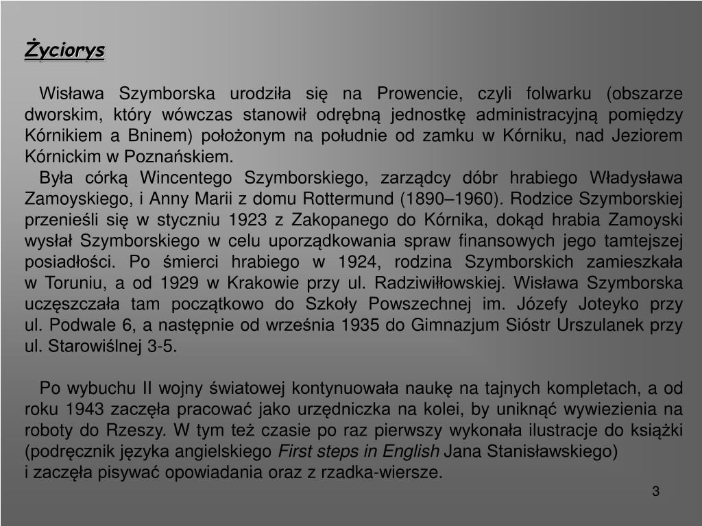 Życiorys Wisława Szymborska urodziła się na Prowencie, czyli folwarku (obszarze dworskim, który wówczas stanowił odrębną jednostkę administracyjną pomiędzy Kórnikiem a Bninem) położonym na południe od zamku w Kórniku, nad Jeziorem Kórnickim w Poznańskiem. Była córką Wincentego Szymborskiego, zarządcy dóbr hrabiego Władysława Zamoyskiego, i Anny Marii z domu Rottermund (1890–1960). Rodzice Szymborskiej przenieśli się w styczniu 1923 z Zakopanego do Kórnika, dokąd hrabia Zamoyski wysłał Szymborskiego w celu uporządkowania spraw finansowych jego tamtejszej posiadłości. Po śmierci hrabiego w 1924, rodzina Szymborskich zamieszkała w Toruniu, a od 1929 w Krakowie przy ul. Radziwiłłowskiej. Wisława Szymborska uczęszczała tam początkowo do Szkoły Powszechnej im. Józefy Joteyko przy ul. Podwale 6, a następnie od września 1935 do Gimnazjum Sióstr Urszulanek przy ul. Starowiślnej 3-5. Po wybuchu II wojny światowej kontynuowała naukę na tajnych kompletach, a od roku 1943 zaczęła pracować jako urzędniczka na kolei, by uniknąć wywiezienia na roboty do Rzeszy. W tym też czasie po raz pierwszy wykonała ilustracje do książki (podręcznik języka angielskiego First stepsinEnglishJana Stanisławskiego) i zaczęła pisywać opowiadania oraz z rzadka-wiersze.