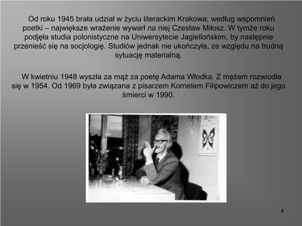 Od roku 1945 brała udział w życiu literackim Krakowa; według wspomnień poetki – największe wrażenie wywarł na niej Czesław Miłosz. W tymże roku podjęła studia polonistyczne na Uniwersytecie Jagiellońskim, by następnie przenieść się na socjologię. Studiów jednak nie ukończyła, ze względu na trudną sytuację materialną. W kwietniu 1948 wyszła za mąż za poetę Adama Włodka. Z mężem rozwiodła się w 1954. Od 1969 była związana z pisarzem Kornelem Filipowiczem aż do jego śmierci w 1990.