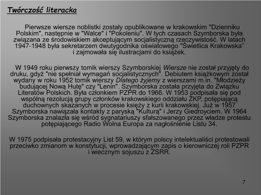 Twórczość literacka • Pierwsze wiersze noblistki zostały opublikowane w krakowskim "Dzienniku Polskim", następnie w "Walce" i "Pokoleniu". W tych czasach Szymborska była związana ze środowiskiem akceptującym socjalistyczną rzeczywistość. W latach 1947-1948 była sekretarzem dwutygodnika oświatowego "Świetlica Krakowska” i zajmowała się ilustracjami do książek. • W 1949 roku pierwszy tomik wierszy Szymborskiej Wiersze nie został przyjęty do druku, gdyż "nie spełniał wymagań socjalistycznych". Debiutem książkowym został wydany w roku 1952 tomik wierszy Dlatego żyjemy z wierszami m.in. "Młodzieży budującej Nową Hutę" czy "Lenin". Szymborska została przyjęta do Związku Literatów Polskich. Była członkiem PZPR do 1966. W 1953 podpisała się pod wspólną rezolucją grupy członków krakowskiego oddziału ZKP, potępiającą duchownych skazanych w procesie księży z kurii krakowskiej. Już w 1957 Szymborska nawiązała kontakty z paryską "Kulturą" i Jerzy Giedroyciem. W 1964 Szymborska znalazła się wśród sygnatariuszy sfałszowanego przez władze protestu potępiającego Radio Wolna Europa za nagłośnienie Listu 34. • W 1975 podpisała protestacyjny List 59, w którym polscy intelektualiści protestowali przeciwko zmianom w konstytucji, wprowadzającym zapis o kierowniczej roli PZPR i wiecznym sojuszu z ZSRR.