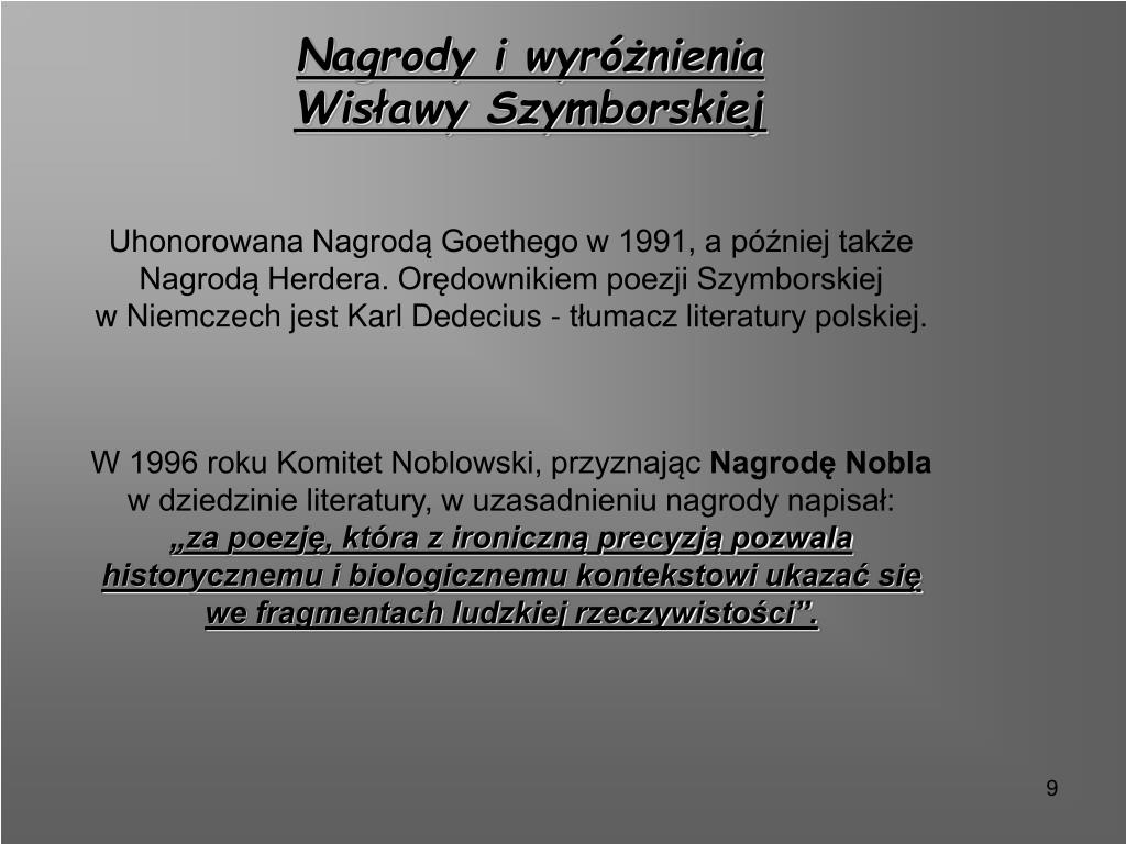 Nagrody i wyróżnienia Wisławy Szymborskiej Uhonorowana Nagrodą Goethego w 1991, a później także Nagrodą Herdera. Orędownikiem poezji Szymborskiej w Niemczech jest Karl Dedecius - tłumacz literatury polskiej. W 1996 roku Komitet Noblowski, przyznając Nagrodę Nobla w dziedzinie literatury, w uzasadnieniu nagrody napisał: „za poezję, która z ironiczną precyzją pozwala historycznemu i biologicznemu kontekstowi ukazać się we fragmentach ludzkiej rzeczywistości”.