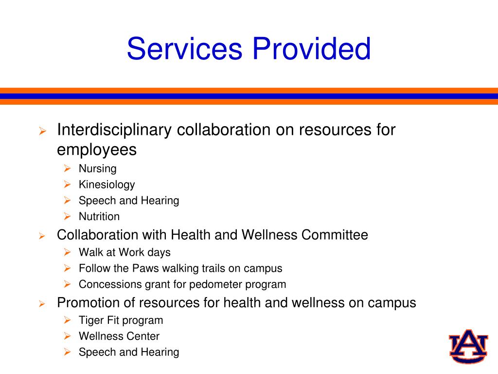 Services Provided • Interdisciplinary collaboration on resources for employees • Nursing • Kinesiology • Speech and Hearing • Nutrition • Collaboration with Health and Wellness Committee • Walk at Work days • Follow the Paws walking trails on campus • Concessions grant for pedometer program • Promotion of resources for health and wellness on campus • Tiger Fit program • Wellness Center • Speech and Hearing