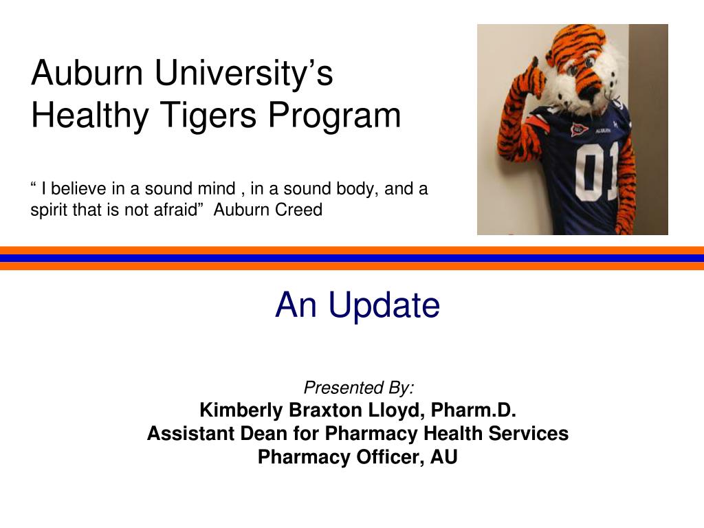 Auburn University ’ s Healthy Tigers Program “ I believe in a sound mind , in a sound body, and a spirit that is not afraid ” Auburn Creed. An Update Presented By: Kimberly Braxton Lloyd, Pharm.D . Assistant Dean for Pharmacy Health Services Pharmacy Officer, AU.
