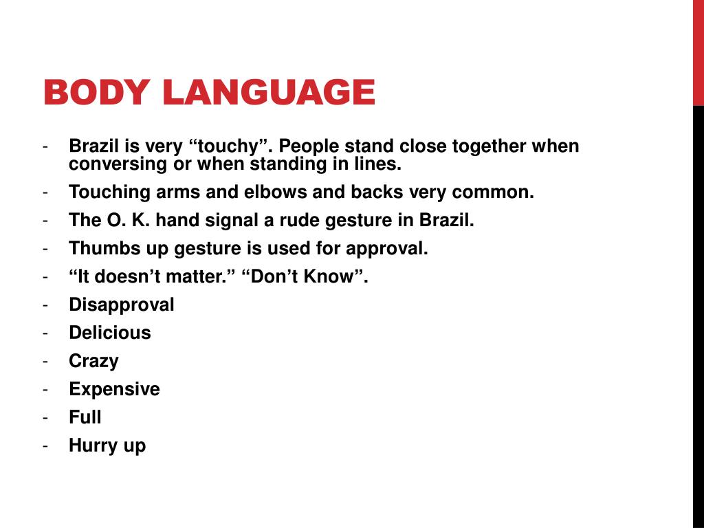 Body Language Con’t • Closeness • Come here – “Psiupsiu • Watch out • Papo- Furado • Let’s eat! • Let’s have a cafezinho! • Let’s drink a beer.