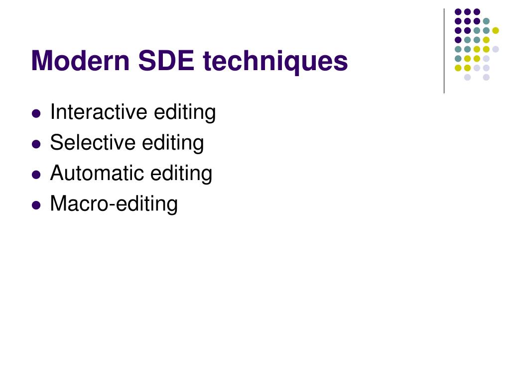 Modern SDE techniques • Interactive editing • Selective editing • Automatic editing • Macro-editing