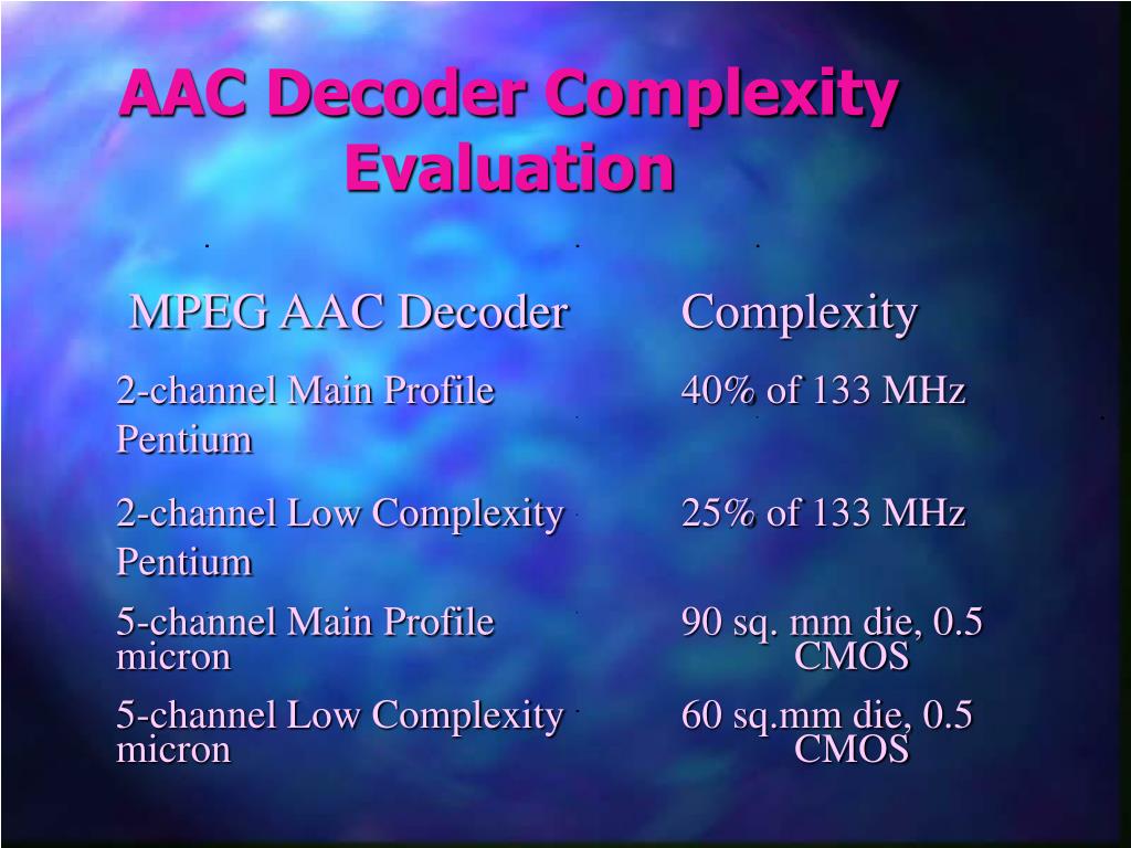 AAC Decoder ComplexityEvaluation MPEG AAC Decoder Complexity 2-channel Main Profile 40% of 133 MHz Pentium 2-channel Low Complexity 25% of 133 MHz Pentium 5-channel Main Profile 90 sq. mm die, 0.5 micron CMOS 5-channel Low Complexity 60 sq.mm die, 0.5 micron CMOS