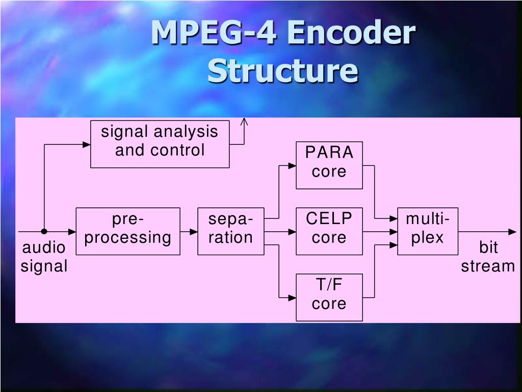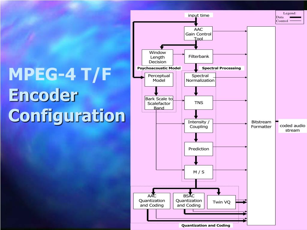 Definitions • T/F Time/Frequency (MDCT transform) • AAC Advanced Audio Coding • PARA Parametric • CELP Code Excited Linear Prediction • SA Structured Audio • PNS Perceptual Noise Substitution • HVXC Harmonic Vector eXcitation Coding • HILN Harmonic and Individual Line + Noise • SAOL Structured Audio Orchestra Language • SASL Structured Audio Score Language • MIDI Musical Instrument Digital Interface • TTS Text to Speech