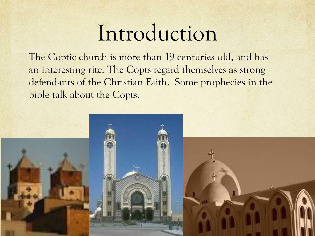 Introduction The Coptic church is more than 19 centuries old, and has an interesting rite. The Copts regard themselves as strong defendants of the Christian Faith. Some prophecies in the bible talk about the Copts.