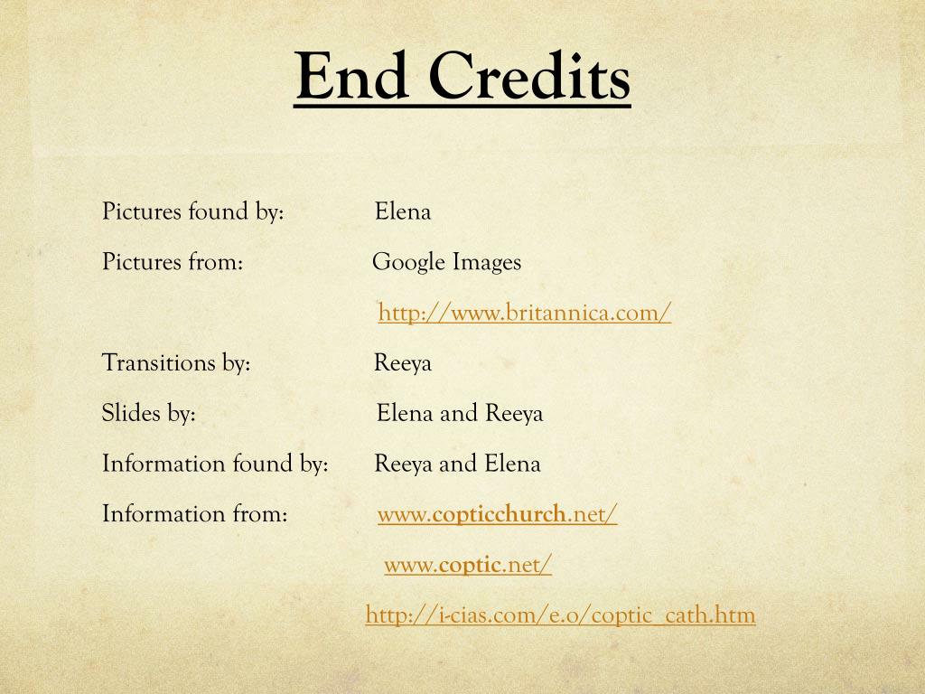 End Credits Pictures found by: Elena Pictures from: Google Images http://www.britannica.com/ Transitions by: Reeya Slides by: Elena and Reeya Information found by: Reeya and Elena Information from: www.copticchurch.net/ www.coptic.net/ http://i-cias.com/e.o/coptic_cath.htm
