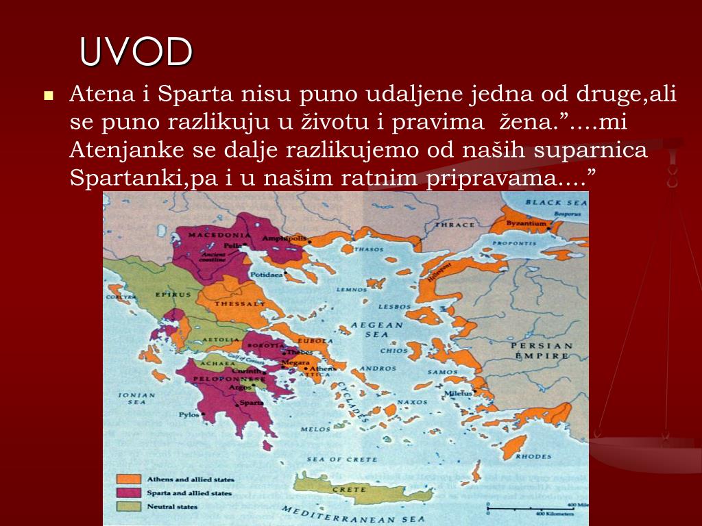 UVOD • Atena i Sparta nisu puno udaljene jedna od druge,ali se puno razlikuju u životu i pravima žena.”....mi Atenjanke se dalje razlikujemo od naših suparnica Spartanki,pa i u našim ratnim pripravama....”