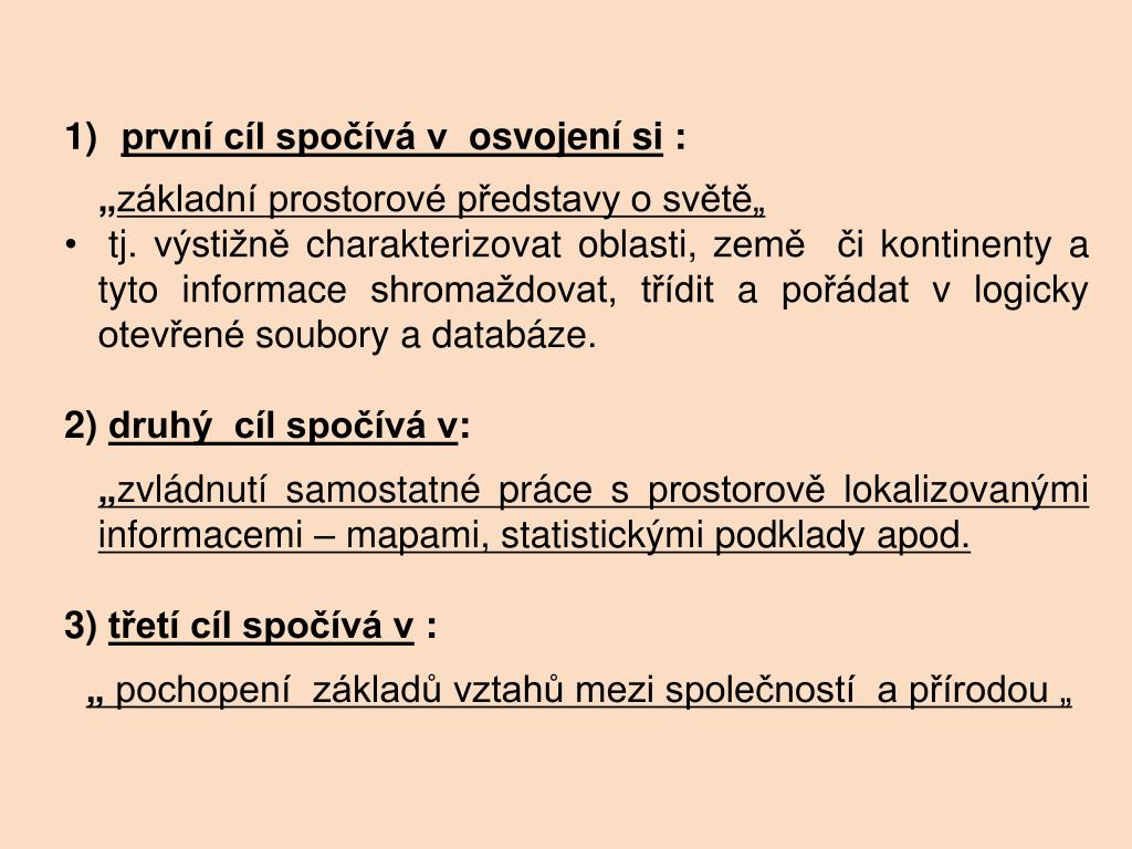 první cíl spočívá v osvojení si : „základní prostorové představy o světě„ • tj. výstižně charakterizovat oblasti, země či kontinenty a tyto informace shromaždovat, třídit a pořádat v logicky otevřené soubory a databáze. 2) druhý cíl spočívá v: „zvládnutí samostatné práce s prostorově lokalizovanými informacemi – mapami, statistickými podklady apod. 3) třetí cíl spočívá v : „ pochopení základů vztahů mezi společností a přírodou „