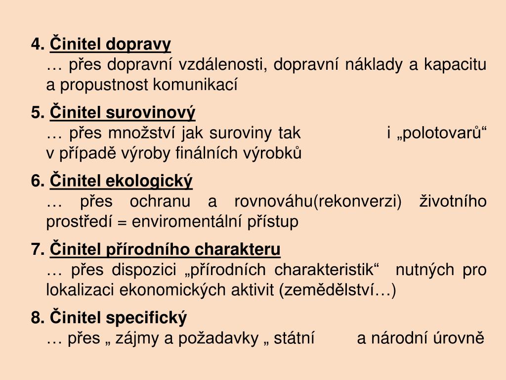 4. Činitel dopravy … přes dopravní vzdálenosti, dopravní náklady a kapacitu a propustnost komunikací 5. Činitel surovinový … přes množství jak suroviny tak i „polotovarů“ v případě výroby finálních výrobků 6. Činitel ekologický … přes ochranu a rovnováhu(rekonverzi) životního prostředí = enviromentální přístup 7. Činitel přírodního charakteru … přes dispozici „přírodních charakteristik“ nutných pro lokalizaci ekonomických aktivit (zemědělství…) 8. Činitel specifický … přes „ zájmy a požadavky „ státní a národní úrovně