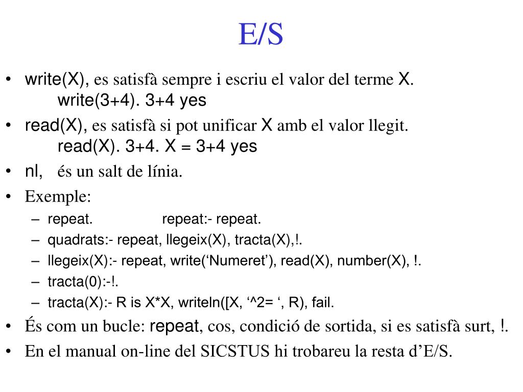 E/S • write(X), es satisfà sempre i escriu el valor del terme X. write(3+4). 3+4 yes • read(X), es satisfà si pot unificar X amb el valor llegit. read(X). 3+4. X = 3+4 yes • nl, és un salt de línia. • Exemple: • repeat. repeat:- repeat. • quadrats:- repeat, llegeix(X), tracta(X),!. • llegeix(X):- repeat, write(‘Numeret’), read(X), number(X), !. • tracta(0):-!. • tracta(X):- R is X*X, writeln([X, ‘^2= ‘, R), fail. • És com un bucle: repeat, cos, condició de sortida, si es satisfà surt, !. • En el manual on-line del SICSTUS hi trobareu la resta d’E/S.