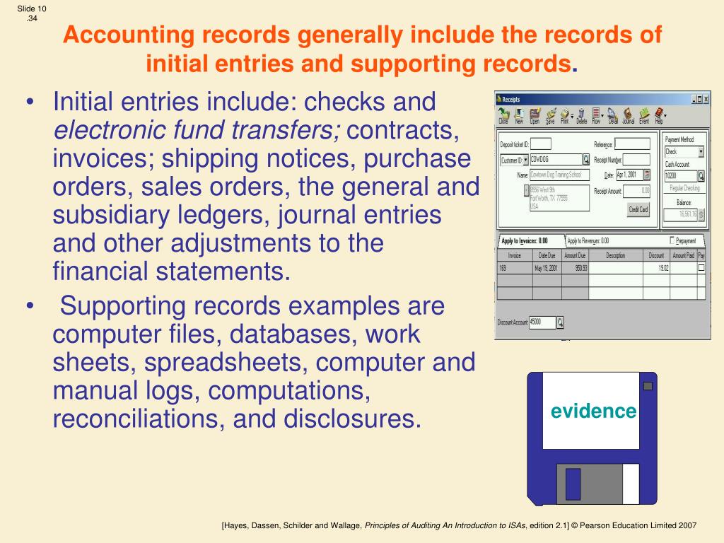 evidence Accounting records generally include the records of initial entries and supporting records. • Initial entries include: checks and electronic fund transfers; contracts, invoices; shipping notices, purchase orders, sales orders, the general and subsidiary ledgers, journal entries and other adjustments to the financial statements. • Supporting records examples are computer files, databases, work sheets, spreadsheets, computer and manual logs, computations, reconciliations, and disclosures.
