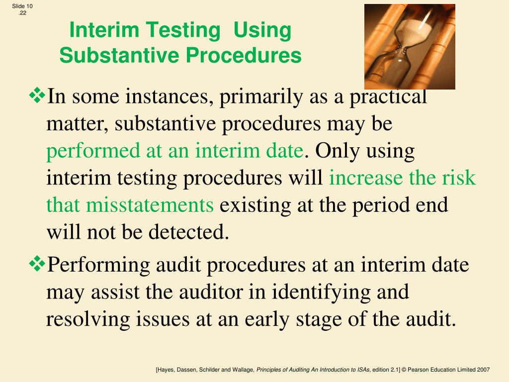 Interim Testing Using Substantive Procedures • In some instances, primarily as a practical matter, substantive procedures may be performed at an interim date. Only using interim testing procedures will increase the risk that misstatements existing at the period end will not be detected. • Performing audit procedures at an interim date may assist the auditor in identifying and resolving issues at an early stage of the audit.