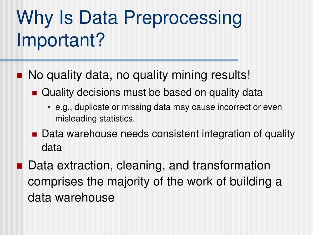 Why Is Data Preprocessing Important? • No quality data, no quality mining results! • Quality decisions must be based on quality data • e.g., duplicate or missing data may cause incorrect or even misleading statistics. • Data warehouse needs consistent integration of quality data • Data extraction, cleaning, and transformation comprises the majority of the work of building a data warehouse