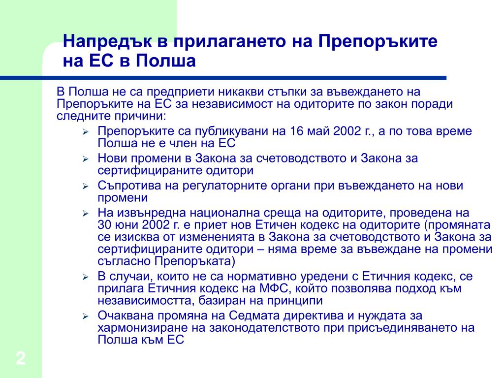 Напредък в прилагането на Препоръките на ЕС в Полша В Полша не са предприети никакви стъпки за въвеждането на Препоръките на ЕС за независимост на одиторите по закон поради следните причини: • Препоръките са публикувани на 16 май 2002 г., а по това време Полша не е член на ЕС • Нови промени в Закона за счетоводството и Закона за сертифицираните одитори • Съпротива на регулаторните органи при въвеждането на нови промени • На извънредна национална среща на одиторите, проведена на 30 юни 2002 г. е приет нов Етичен кодекс на одиторите (промяната се изисква от измененията в Закона за счетоводството и Закона за сертифицираните одитори – няма време за въвеждане на промени съгласно Препоръката) • В случаи, които не са нормативно уредени с Етичния кодекс, се прилага Етичния кодекс на МФС, който позволява подход към независимостта, базиран на принципи • Очаквана промяна на Седмата директива и нуждата за хармонизиране на законодателството при присъединяването на Полша към ЕС