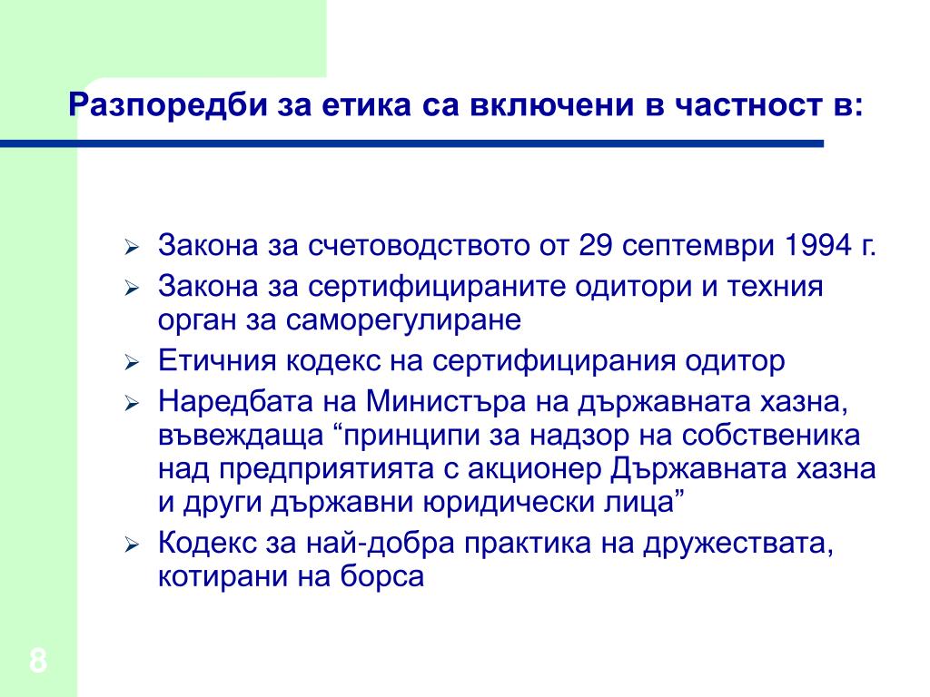 Етични въпроси, регулирани в Закона за счетоводството продължение • Принципът за безпристрастност и независимост, разгледан в т. 2, се отнася съответно за дружества, упълномощени да одитират финансови отчети и членове на управителния съвет и надзорните органи на тези предприятия или други лица, които участват в одита на такива финансови отчети. • Предприятието, описано в т. 3 е избрано от органа, който утвърждава финансовите отчети на предприятието, освен когато уставът или други подзаконови актове, обвързващи предприятието, разпореждат друго.