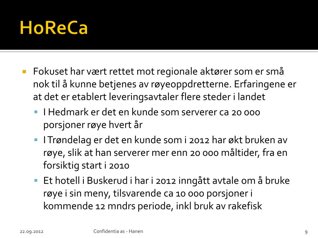 Regionale og lokale aktører. • En landsomfattende restaurantkjede har inngått avtale om bruk av røye i sin meny. • Forbruket har tatt helt av – sett i relasjon til røyeoppdretterens forventinger – og forbruket har passert 1000 kg pr måned og er stadig økende. • Flere oppdrettere samarbeider om å fylle kontraktsforpliktelsen til denne kunden • HoReCa er krevende, en porsjon skal være innenfor gitte vektnivåer - ikke for liten, ikke for stor. Dette er svært krevende for små oppdrettere fordi fisken ikke vokser jevnt og kunden vil ha minst mulig arbeid på sitt eget kjøkken. Confidentia as - Hanen