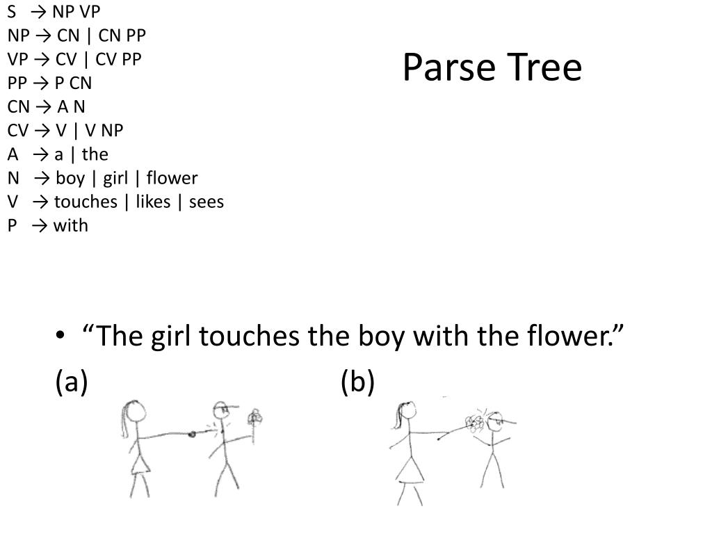 Sometimes a string can be parsed two different ways. S → NP VP NP → CN | CN PP VP → CV | CV PP PP → P CN CN → A N CV → V | V NP A → a | the N → boy | girl | flower V → touches | likes | sees P → with S = Sentence NP = Noun-Phrase VP = Verb-Phrase PP = Prep-Phrase CN = Complex-Noun CV = Complex-Verb A = Article N = Noun V = Verb P = Preposition