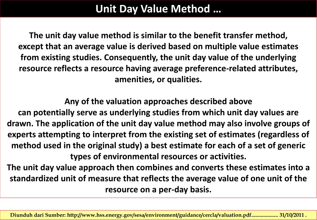 Unit Day Value Method … The unit day value method is similar to the benefit transfer method, except that an average value is derived based on multiple value estimates from existing studies. Consequently, the unit day value of the underlying resource reflects a resource having average preference-related attributes, amenities, or qualities. Any of the valuation approaches described above can potentially serve as underlying studies from which unit day values are drawn. The application of the unit day value method may also involve groups of experts attempting to interpret from the existing set of estimates (regardless of method used in the original study) a best estimate for each of a set of generic types of environmental resources or activities. The unit day value approach then combines and converts these estimates into a standardized unit of measure that reflects the average value of one unit of the resource on a per-day basis. DiunduhdariSumber: http://www.hss.energy.gov/sesa/environment/guidance/cercla/valuation.pdf.................... 31/10/2011 .