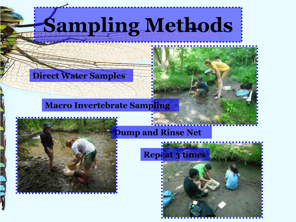 Sampling Methods Direct Water Samples Macro Invertebrate Sampling Dump and Rinse Net Repeat 3 times