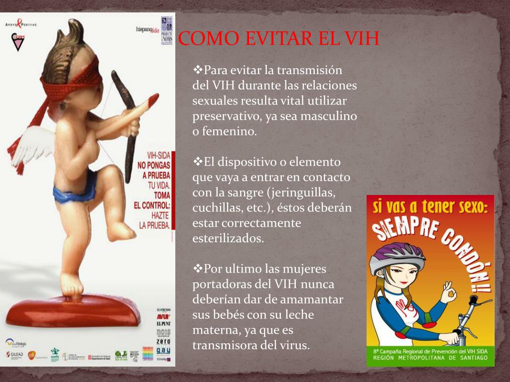 COMO EVITAR EL VIH • Para evitar la transmisión del VIH durante las relaciones sexuales resulta vital utilizar preservativo, ya sea masculino o femenino. • El dispositivo o elemento que vaya a entrar en contacto con la sangre (jeringuillas, cuchillas, etc.), éstos deberán estar correctamente esterilizados. • Por ultimo las mujeres portadoras del VIH nunca deberían dar de amamantar sus bebés con su leche materna, ya que es transmisora del virus.
