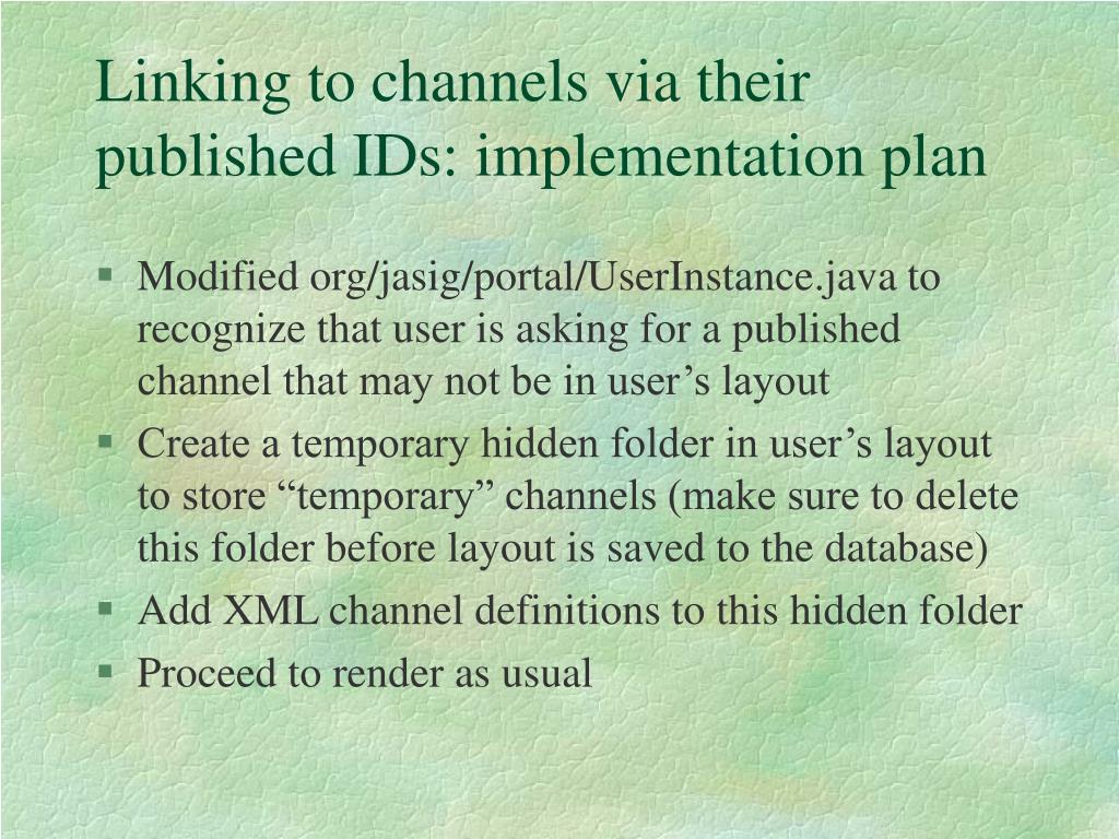 Linking to channels via their published IDs: implementation plan • Modified org/jasig/portal/UserInstance.java to recognize that user is asking for a published channel that may not be in user’s layout • Create a temporary hidden folder in user’s layout to store “temporary” channels (make sure to delete this folder before layout is saved to the database) • Add XML channel definitions to this hidden folder • Proceed to render as usual