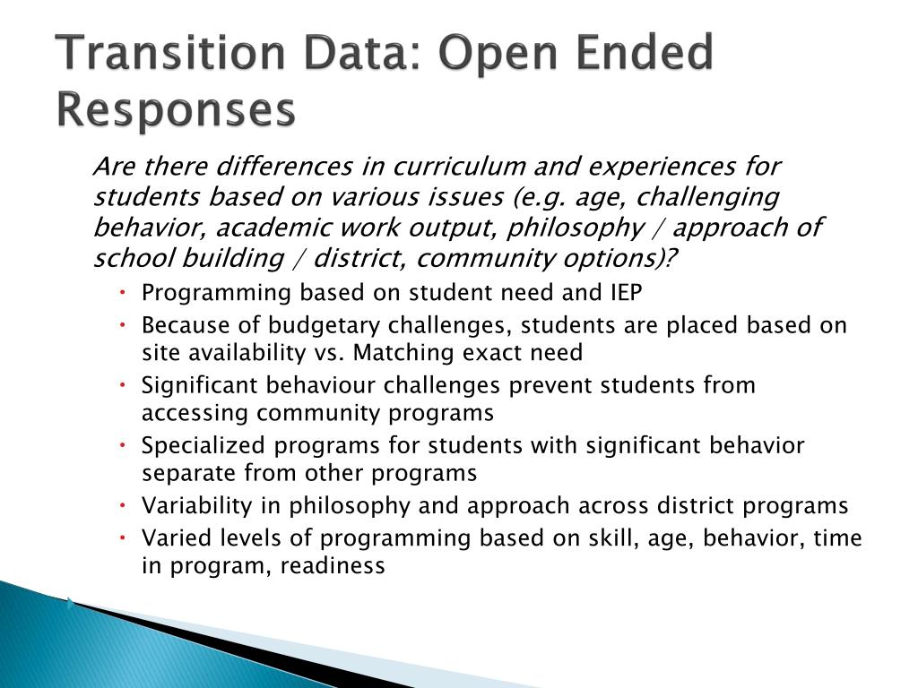 Transition Data: Open Ended Responses Are there differences in curriculum and experiences for students based on various issues (e.g. age, challenging behavior, academic work output, philosophy / approach of school building / district, community options)? • Programming based on student need and IEP • Because of budgetary challenges, students are placed based on site availability vs. Matching exact need • Significant behaviour challenges prevent students from accessing community programs • Specialized programs for students with significant behavior separate from other programs • Variability in philosophy and approach across district programs • Varied levels of programming based on skill, age, behavior, time in program, readiness