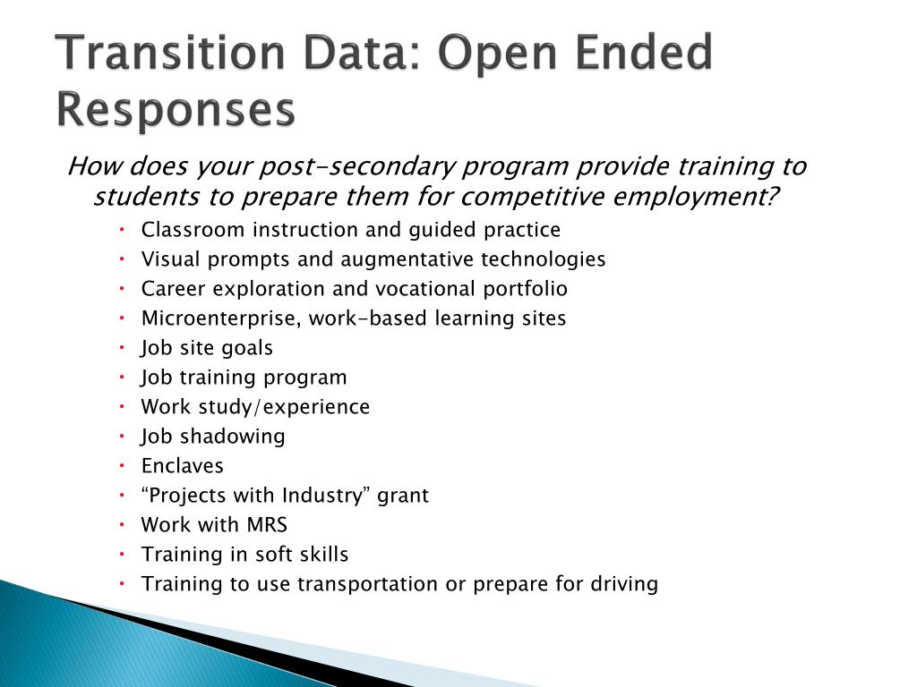 Transition Data: Open Ended Responses How does your post-secondary program provide training to students to prepare them for competitive employment? • Classroom instruction and guided practice • Visual prompts and augmentative technologies • Career exploration and vocational portfolio • Microenterprise, work-based learning sites • Job site goals • Job training program • Work study/experience • Job shadowing • Enclaves • “Projects with Industry” grant • Work with MRS • Training in soft skills • Training to use transportation or prepare for driving