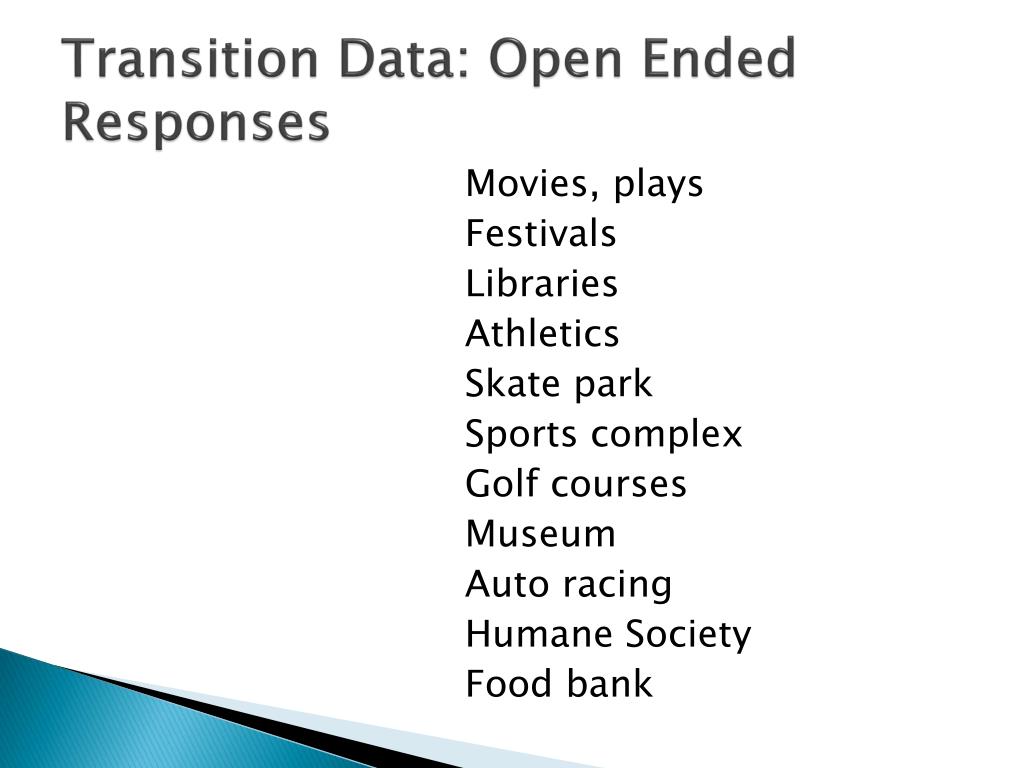 Transition Data: Open Ended Responses Movies, plays Festivals Libraries Athletics Skate park Sports complex Golf courses Museum Auto racing Humane Society Food bank