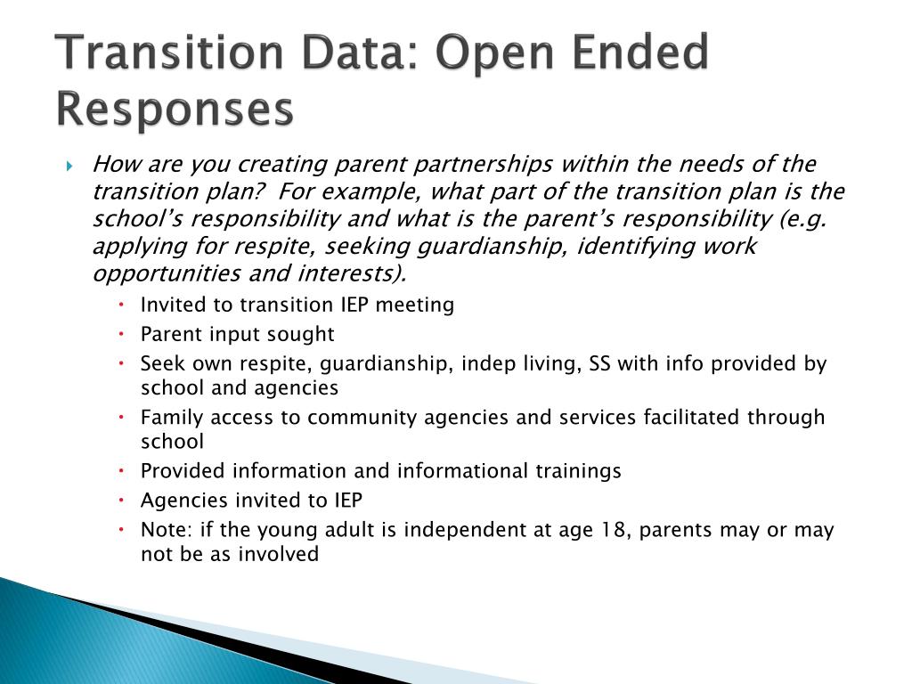 Transition Data: Open Ended Responses • How are you creating parent partnerships within the needs of the transition plan? For example, what part of the transition plan is the school’s responsibility and what is the parent’s responsibility (e.g. applying for respite, seeking guardianship, identifying work opportunities and interests). • Invited to transition IEP meeting • Parent input sought • Seek own respite, guardianship, indep living, SS with info provided by school and agencies • Family access to community agencies and services facilitated through school • Provided information and informational trainings • Agencies invited to IEP • Note: if the young adult is independent at age 18, parents may or may not be as involved