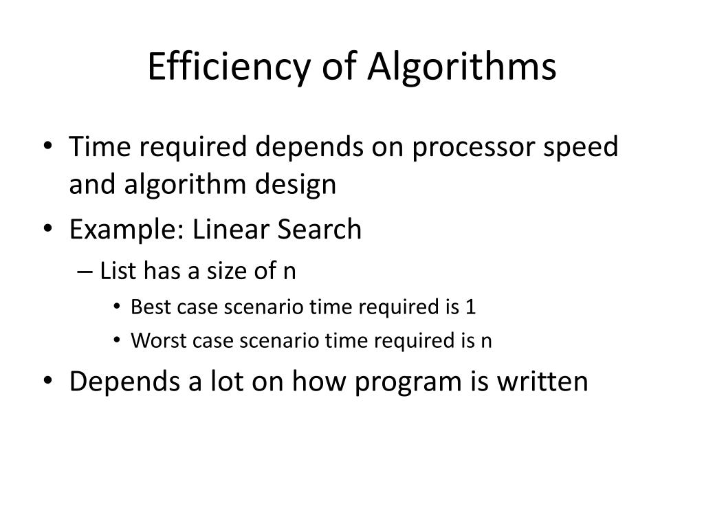 Efficiency of Algorithms • Time required depends on processor speed and algorithm design • Example: Linear Search • List has a size of n • Best case scenario time required is 1 • Worst case scenario time required is n • Depends a lot on how program is written