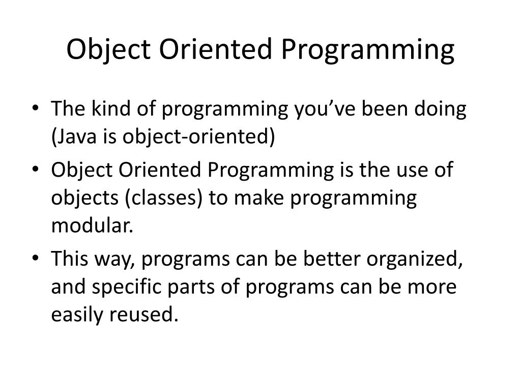 Object Oriented Programming • The kind of programming you’ve been doing (Java is object-oriented) • Object Oriented Programming is the use of objects (classes) to make programming modular. • This way, programs can be better organized, and specific parts of programs can be more easily reused.